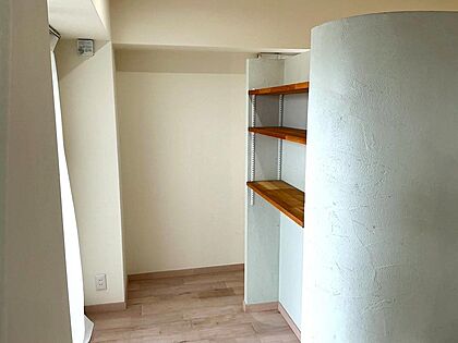 優しいブルーの珪藻土はこだわりのマルチスペース。子供の秘密基地やお片付けスペースなど使い方は様々♪