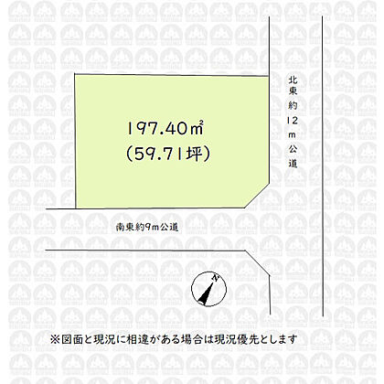 | 土地面積/坪(坪単価) | 197.40m2(登記簿)/59.82坪(33.10万円) | 代表的な接道 | 角地 公道 北東 12m、南東 9m ※詳細は備考欄をご確認ください |