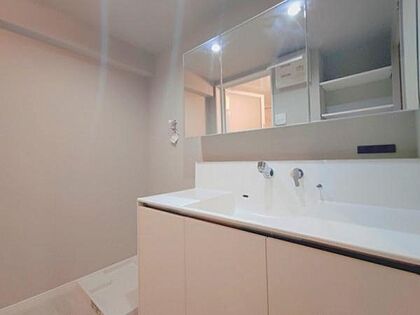 収納が充実した洗面台で、洗面用品やスキンケア用品をすっきり整理整頓。使いやすく、いつも清潔な空間を保てます。毎日の身支度が快適に。