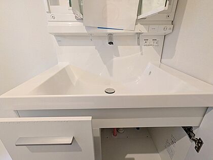 三面鏡にハンドシャワー付き、 使いやすい洗面台。