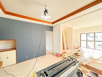 【リフォーム中 キッチン】LDK南側の和室6畳は少しだけ和のテイストを残しながら機能的な洋風リビングに造り替えています。一段上がったスペースになるので、広いLDKにちょっとした空間の変化を演出します。