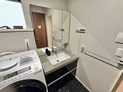 室内(2025年5月)撮影。洗面台です♪スタイリッシュでありながらも、収納力もあります♪キッチン同様、傷に強くお手入れが簡単ですよ♪