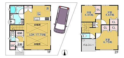 土地面積:公簿107.65m2(約32.56坪)、建物面積:86.74m2(1階47.82m2・2階38.92m2)2018年建築の3LDK