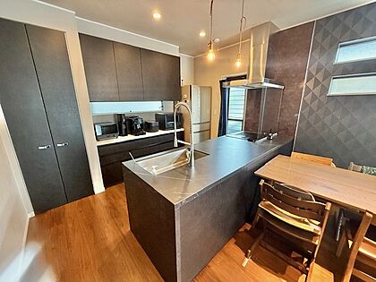 室内(2025年5月)撮影。壁等がなく、開放的なカウンターキッチン!料理をしながらご家族との会話も楽しめる上、便利なパントリーや備え付けの収納が設置されております♪