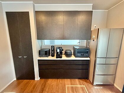 室内(2025年5月)撮影。キッチンにはパントリーや備え付けの収納が設置されております♪キッチン回りをすっきりさせることができ、家事も快適に、効率的に行えますね♪