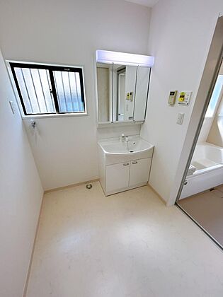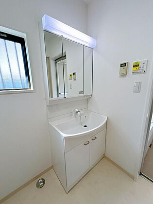 【リフォーム済】洗面化粧台は三面鏡タイプを採用しました。朝の支度がしやすく、見た目もすっきりします。