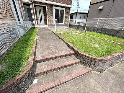 玄関前アプローチです。リビング前には庭部分があり洗濯物を干したりお子様とプール遊ぶができるスペースがあります。