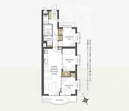 ファミリーにおすすめの3LDK間取り。お子様用、プライベートルーム、寝室など用途に応じて活用しやすい間取りですね。