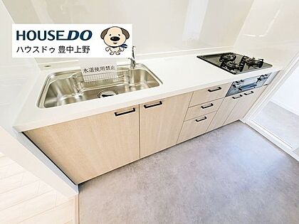 新調されたシステムキッチンには、三口コンロと広々としたシンクが備わっており、使いやすい設計が魅力です。
