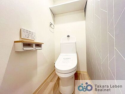 ウォシュレット機能付きのトイレは壁掛けリモコンの上位グレードを採用。便座がスッキリした印象となり、限られた空間を広く見せる効果があります。
