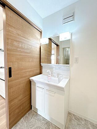 【リフォーム後】洗面化粧台は新品に交換しました。3面鏡なので収納力も豊富で鏡の角度を変えて使えるのが良いですね。