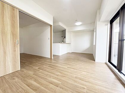 バルコニーに面した広々とした窓のあるリビングです。