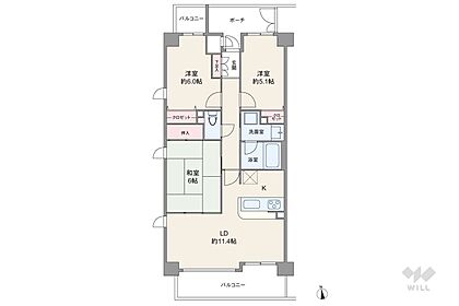 間取りは専有面積68.73平米の3LDK。両面バルコニー・専用ポーチ付きで、共用廊下に面した窓が無い独立性の高いプラン。バルコニー面積は11.01平米です。バルコニーに面したLDKは横長タイプです。