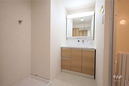 洗面室、三面裏収納のついた洗面所。化粧品やスタイリング剤・ドライヤー・ブラシなどの小物までが収納できます[2025年8月18日撮影]