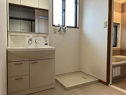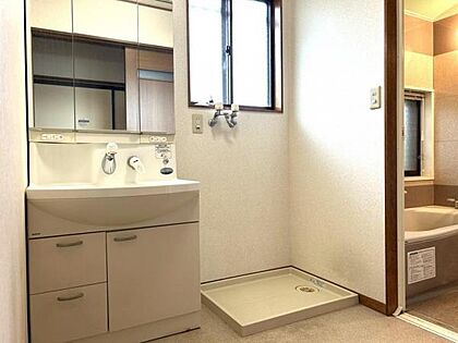 洗面所三面鏡付き洗面台で身だしなみチェックもバッチリ。収納力もあり洗面所が美しく保てます。