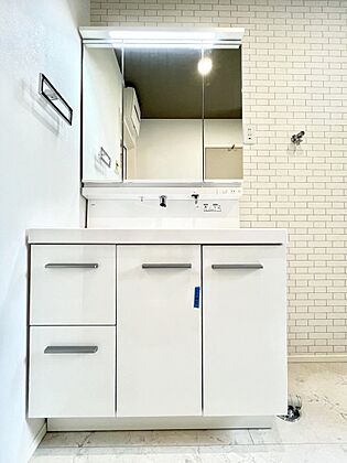 ◆1号棟◆三面鏡の裏に、化粧品や衛生用品などを収納可能。洗面台をすっきりと保ちます!