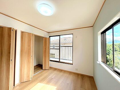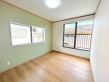 •  【リフォーム済】2階東側約6帖の洋室写真です。こちらのお部屋はアクセントクロスにみどり色を入れました。朝日が目覚まし時計代わりになるお部屋、早起きが苦手な方におススメします。
