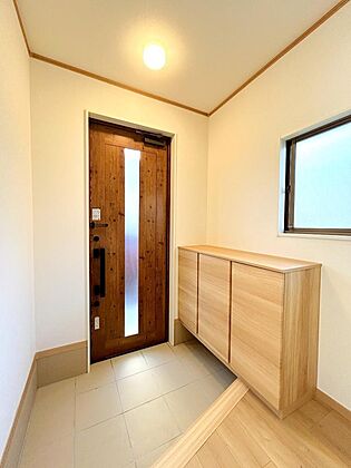 •  【リフォーム済】玄関ホールは、照明器具交換、壁・天井クロス張替を行いました。新品のシューズボックスを設置したので、玄関先がスッキリ片付きます。棚板は可動式で好みの高さに調節が可能なので便利です。