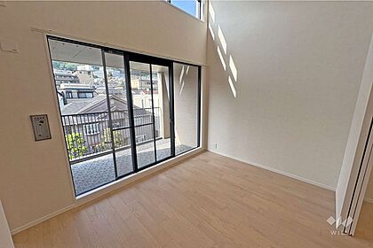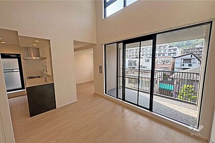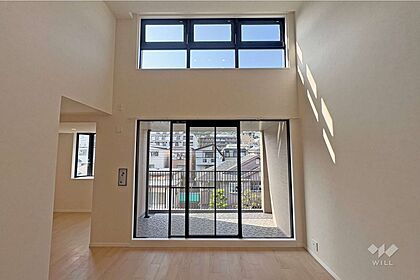 LDKは広々約17.8帖のプラン。2スペースに分かれており、こちらはリビングスペース。バルコニーに面しており、採光・通風良好!天井まで吹抜けなので開放感があります。