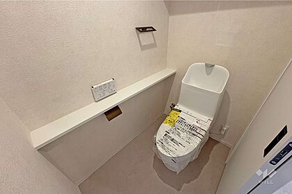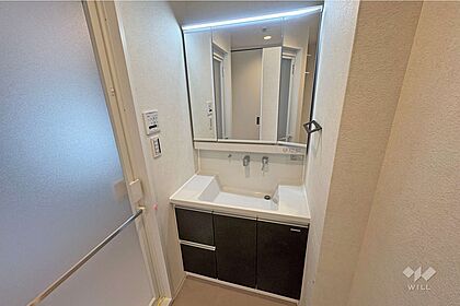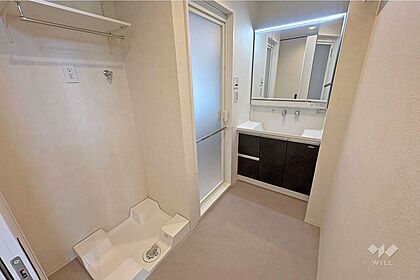 洗面室です。洗濯機置き場の上部に収納棚があるのもうれしいポイント。