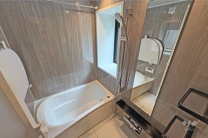 コンパクトな浴室ですが、シックな色味の壁紙でおしゃれな内装です。換気窓があるのがうれしいポイント!