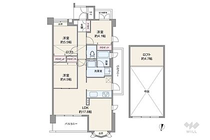 専有面積68.59平米の3LDK。ロフト・天窓・吹抜け採用の開放感のある間取りです。バルコニー面積は11.69平米です。