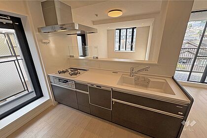 対面システムキッチン(食洗機付)。キッチン横にバルコニーがあり、使い勝手良好です。[2025年5月20日撮影]