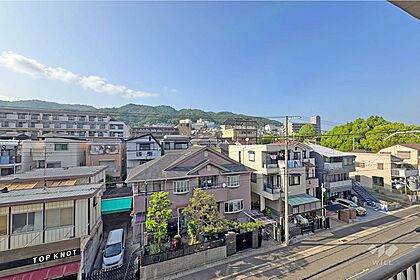 バルコニーからの眺め(北東方向)。閑静な住宅街が広がっています。[2025年5月20日撮影]