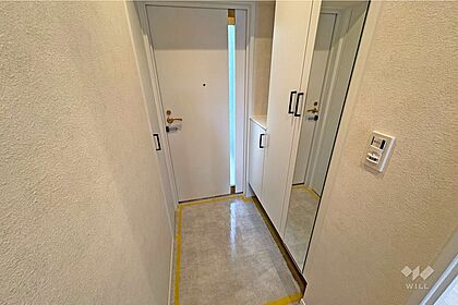 玄関ホールです。シューズボックスがあり、すっきりとした玄関となっています!姿見があるので、お出かけ前にチェックしやすいのがうれしいポイント!