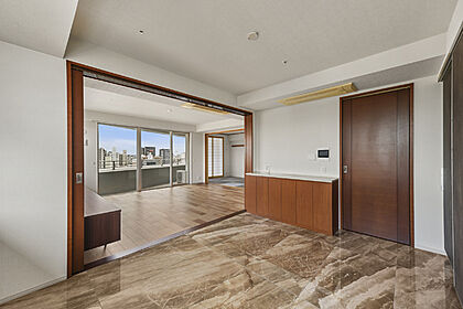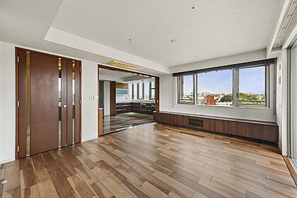 LDKと和室を合わせて29帖超。シーンに応じて一体利用するなどフレキシブルな空間アレンジが可能です。【約12.7帖リビング】