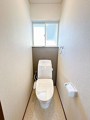 【リフォーム済】1階トイレ。新しい温水洗浄機能付きトイレに交換いたしました。直接肌に触れるところなので設備が新しいと気持ちいいですね。床クッションフロア張替、壁天井クロス張替を行いました。