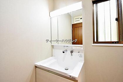 三面鏡の裏には収納がたっぷり。洗面室をすっきりきれいに使えます。