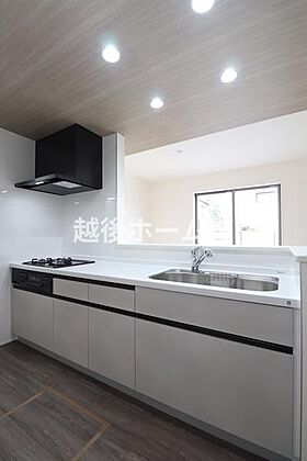 キッチンは使いやすいシステムキッチンです。浄水器一体型の水栓も標準装備しています。