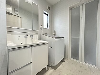 洗面台は鏡が大きいので、朝の慌しい時間もご家族並んで身支度できますね♪