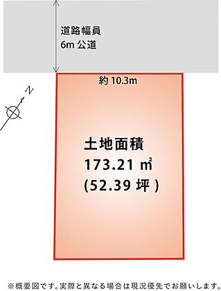 | 土地面積/坪(坪単価) | 173.21m2(登記簿)/52.49坪(63.80万円) | 代表的な接道 | 一方 公道 北西 6m ※詳細は備考欄をご確認ください |