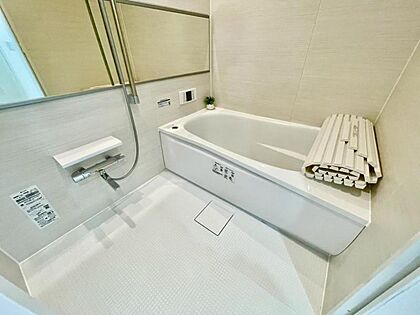 浴室の横長の鏡は、おしゃれで高級感があり、空間を広く見せる効果がありますね