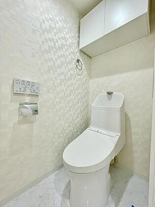 快適なウォシュレット機能付きトイレ!吊戸棚付きでストッキ品や掃除用具などを収納できますね