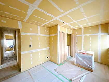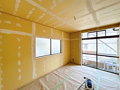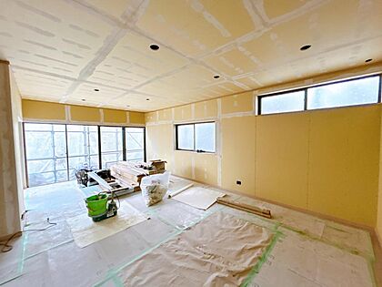 【リフォーム中】約22帖リビング洋室別角度。フローリング重ね張り、天井・壁クロス張替え、建具交換、照明器具交換、スイッチ・コンセント交換を行います。開放感たっぷりのリビングなら憧れの大型テレビも配置で