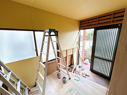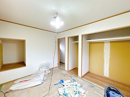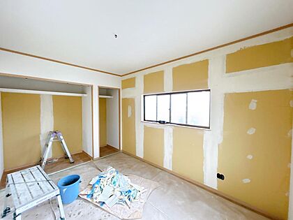 【リフォーム中】2階西側洋室。フローリング重ね張り、天井・壁クロス張替え、建具交換、クローゼット新設、スイッチ・コンセント交換、照明器具交換を行います。南向きの窓からはポカポカ陽光と心地よい風通しを確