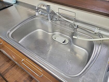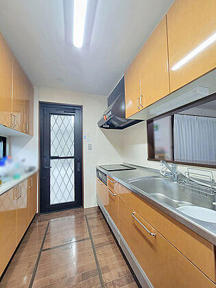 調理しながらの家族間コミュニケーションが増える、対面式キッチン。上部吊戸棚や造り付け収納もあり、すっきりと片付けやすいキッチンです。