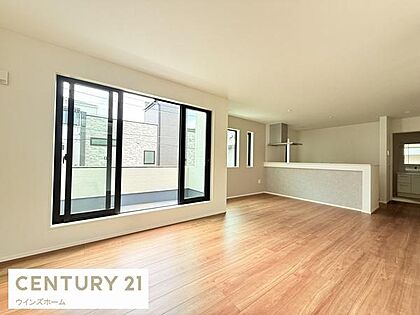プライバシー性の高い2階リビング。19帖のLDKは家族全員がゆったりとくつろげる空間です。バルコニーにつながる大きな窓が特徴的な明るいお部屋。