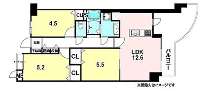 3LDK、専有面積63.37m2、バルコニー面積12.09m2、高階層のため、眺望良好です♪