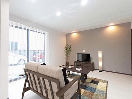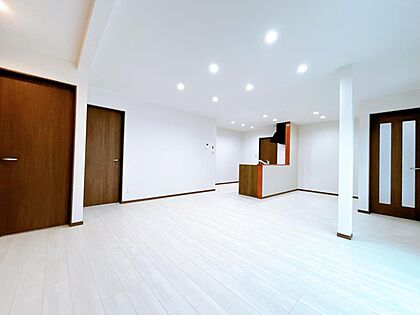 【リフォーム済・即入居可】約20帖のリビングスペースです。対面キッチンです。壁天井のクロス張替え・照明器具交換もおこないました。