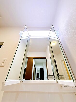 【リフォーム済・即入居可】洗面台です。鏡の裏側に収納スペースがあります。