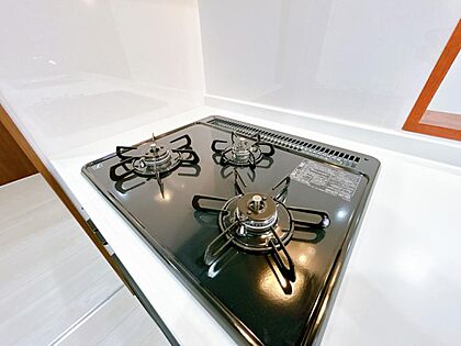 【リフォーム済・即入居可】新品交換済のキッチンは3口コンロなので同時進行で調理可能。大きなお鍋を置いても困らない広さです。