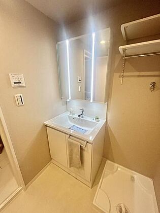 ワイドで使いやすい洗面化粧台。3面鏡裏は収納になっております
