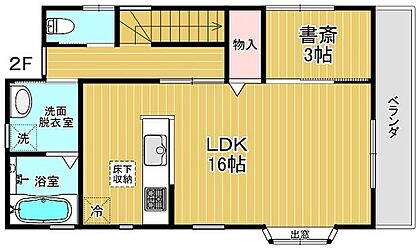 ゆったりLDK16帖の隣には、書斎(スタディールール)がついております。趣味のお部屋としてもお使いいただけます。2階に水廻りがありますので、洗濯も楽々です。