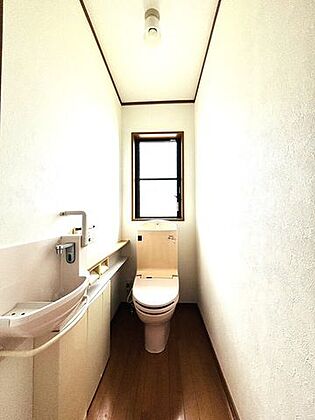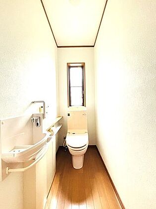 大きな窓付のトイレです。足元も広く、手洗い、収納付で機能的です。