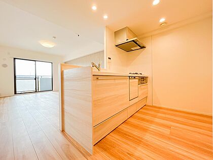 リビング・ダイニングと開放的に繋がる対面式のキッチン。家族やゲストとのコミュニケーションを楽しみながら料理や、家事を行えそう。