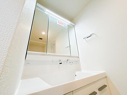 大きな三面鏡付きの洗面台で毎日の身だしなみもばっちりですね。